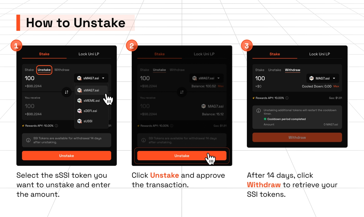 - After your cooldown period ends, you must manually withdraw your tokens.If you have not received your SSI tokens, please first check whether your unstaked tokens are still in cooldown or waiting to be claimed, and complete the withdrawal to receive them.